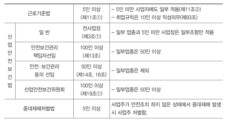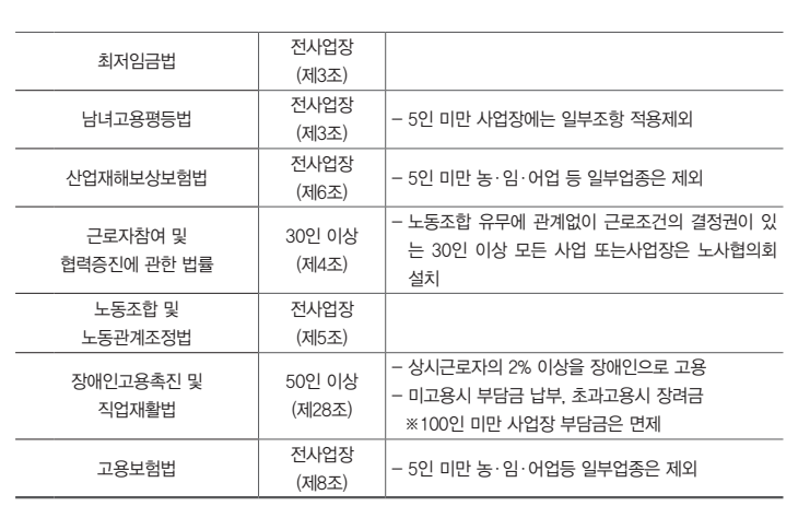 - 일부 업종과 5인 미만 사업장은 일부조항만 적용