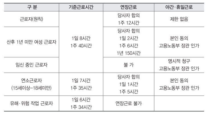 근로기준법에 규정된 법정근로시간을 요약하면 다음과 같다.