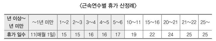 3년 이상 계속 근로한 근로자에 대하여 최초 1년을 초과하는 매 2년마다 1일 을 가산하되 25일을 상한으로 한다. 연차휴가에 대하여 사용자는 근로자의 청 구가 있는 시기에 주어야 한다. 다만, 근로자가 청구한 시기에 휴가를 주는 것 이 사업운영에 막대한 지장이 있는 경우에는 그 시기를 변경할 수 있다. 근로자 대표와 서면합의를 하게 되면 연차 유급휴가일에 갈음하여 특정 근로일에 근로 자를 휴무시킬 수 있다.