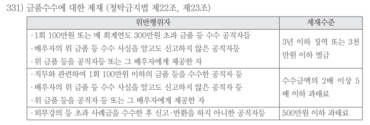 기존의 뇌물죄는 처벌을 위해 ‘직무관련성’과 ‘대가성’을 모두 필요로 하지만, 청탁금지법은 ‘대가성’을 요구하지 않고, 100만원을 초과하는 금품의 수수에는 직무관련성도 없어도 처벌된다. 공직자가 받은 물품이 1회 100만원 또는 회계 연도 기간 300만원을 초과하는 경우에는 직무 관련 여부와 관계없이 공직자와 제공(제공의 약속)한 자 모두 처벌된다. 다만, 수수한 금품이 1회 100만원 이하, 회계연도 300만원 이하인 경우에는 직무관련이 있어야 처벌된다.
