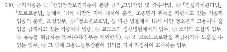 근로기준법에서 사용자는 임산부와 18세 미만자를 도덕상 또는 보건상 유 해·위험한 사업에 사용하지 못한다(제65조). 금지직종은 고압작업 및 잠수작 업, 18세 미만 청소년의 고용이나 출입을 금지하고 있는 직종이나 업종, 교도 소와 정신병원에서의 업무, 소각과 도살의 업무, 유류를 취급하는 업무 등이 다.630) 다만, 유류를 취급하는 업무 중 주유업무는 제외한다.