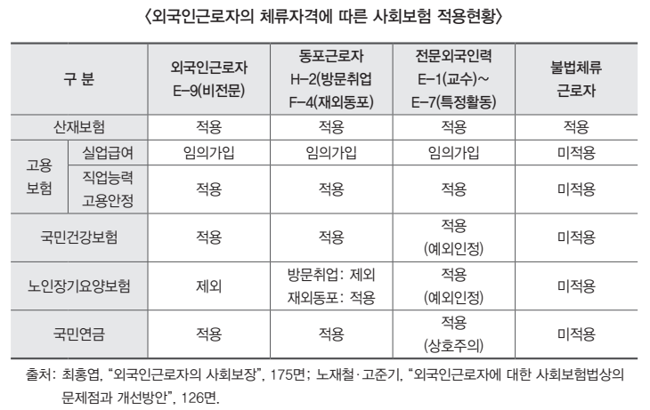 출처: 최홍엽, “외국인근로자의 사회보장”, 175면; 노재철·고준기, “외국인근로자에 대한 사회보험법상의 문제점과 개선방안”, 126면.