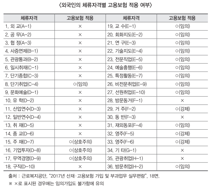 <외국인근로자의 체류자격에 따른 사회보험 적용현황>