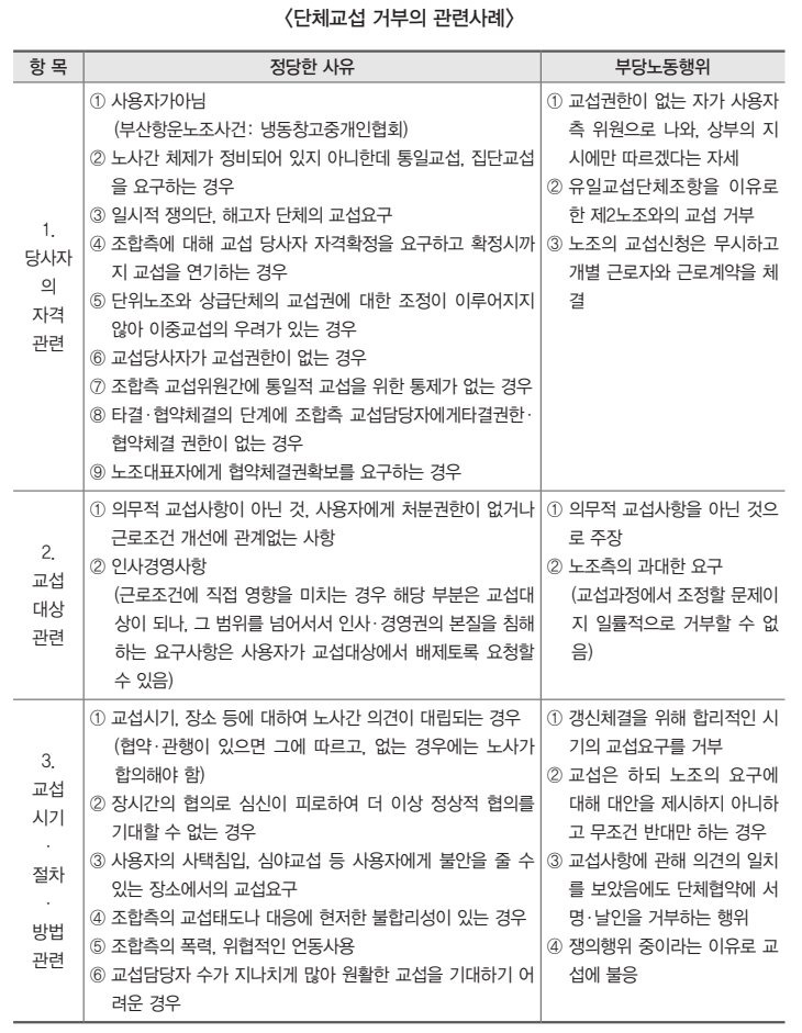 단체교섭거부의 정당한 이유가 있는지 여부는 노사양측의 교섭권자, 노동조 합 측이 요구하는 교섭시간, 교섭장소, 교섭사항 및 교섭태도 등을 종합하여 사회통념상 사용자에게 단체교섭 의무의 이행을 기대하는 것이 어렵다고 인정 되는지 여부에 따라 판단하여야 할 것이다.261)