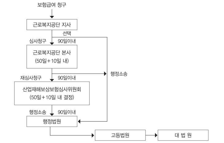 부당해고구제신청과 마찬가지로 행정소송법 개정으로 근로복지공단 지사에 서 부지급이 결정되면, 심사청구(근로복지공단 본사)나 재심사청구(산업재해보상 보험심사위원회)를 거치지 않고 곧바로 행정법원에 행정소송을 제기할 수 있다 (택일). 심사청구, 재심사청구는 신속하고 소송 경제적인 반면 취소율이 높고, 행정소송은 승소율은 높으나 시간과 비용이 많이 든다.