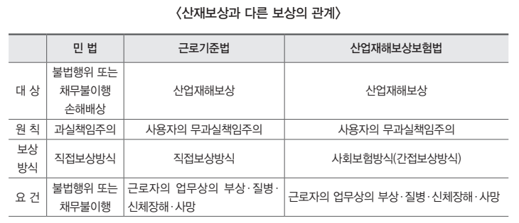 재해근로자가 근로기준법 또는 산업재해보상보험법상 보상을 받는 경우, 사용 자는 근로자에 대한 민사상 손해배상과 관련하여 동일한 사유의 손해에 대해 지급 한 보험급여 금액의 한도 내에서 책임을 면한다. 반면에 재해근로자가 동일한 사 유로 민법, 기타 법령에 의해 재해보상에 상당한 금품을 받은 경우에는 그 가액의 한도 내에서 산업재해보상 보험의 보험급여는 받지 못한다(산재법 제80조 제3항).