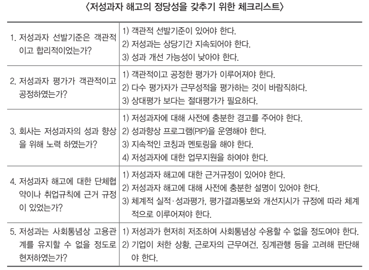 어느 회사나 영업을 잘하는 근로자와 못하는 근로자가 있다. 영업을 잘하는 근로자에게는 인센티브를 주고, 그렇지 못한 근로자에게는 영업을 다시 잘할 수 있도록 인사 상 적합한 조치를 취해야 한다. 그런데 회사에 영업실적이 저조 한 ‘저성과자’에 대하여 인사 상 극단적인 조치인 ‘해고’를 하는 경우가 있는데, 이와 관련하여 노동법은 엄격한 기준을 가지고 근로자를 보호하고 있다. 일반 적으로 정당한 징계해고가 되려면 해고의 사유, 징계의 양정과 절차가 정당해 야 한다. 특히, 저성과자에 대한 해고는 일반적인 징계해고의 기준과 함께 ‘영 업실적 저조’라는 업무적 특성을 고려해 판단해야 한다. 저성과자를 해고하려 면 영업성과 향상을 위한 충분한 기회의 부여 여부, 계속 영업실적의 저조 등을 확인하기 위한 자세한 체크리스트(점검표)가 필요하다.373)