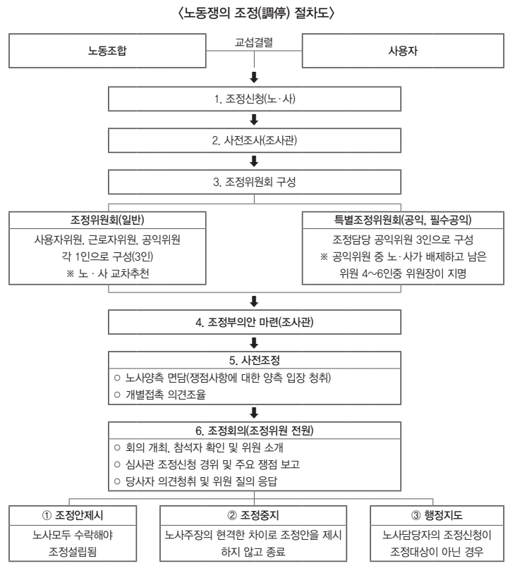 노조법 제45조 제2항은 조정절차를 거친 이후에만 쟁의행위를 할 수 있도록 하고 있고, 또한, 동법 제53조 및 제58조는 관계 당사자의 조정절차에의 성실 참여와 조정위원회의 출석 및 주장을 확인토록 규정하고 있는바, 노동위원회가 관계 당사자의 조정절차 불참으로 “조정중지”를 결정하는 경우에는 조정절차를 거친 것으로 볼 수 없다. 따라서 노동위원회가 조정절차 불참에 따른 조정중지 결정 이후에 별도의 조정절차 없이 쟁의행위는 법 제45조 제2항에 위반되는 쟁의행위이다.