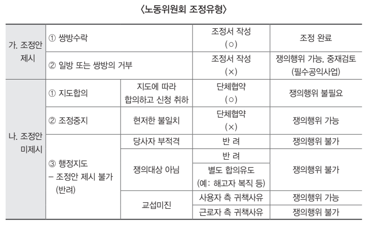조정위원회는 관계 당사자가 수락을 거부하여 더 이상 조정이 이루어질 여지가 없다고 판단되는 경우에는 조정의 종료를 결정하고 이를 관계 당사자 쌍방에 통 보해야 한다.231) 노동쟁의의 조정신청이 조정 또는 중재의 대상이 아니라고 인정 되는 경우에는 그 사유와 다른 해결방법을 알려주어야 한다(행정지도의 결정).