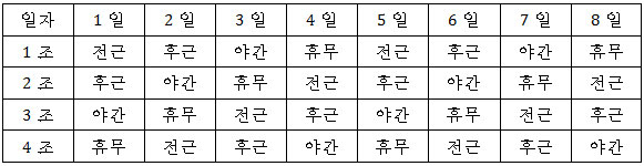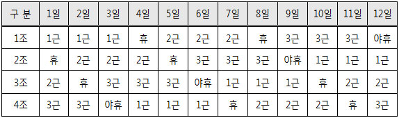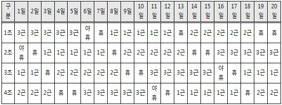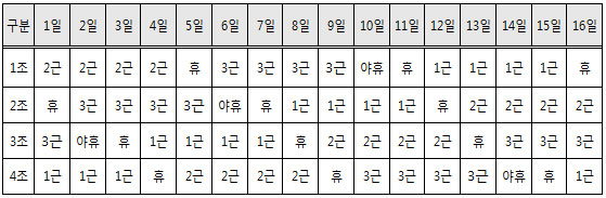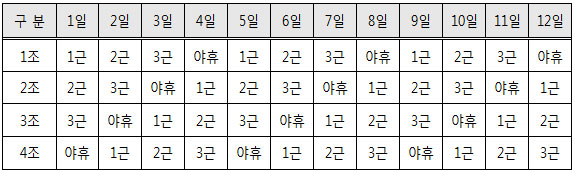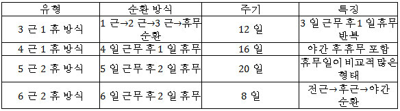 1) 개념 4조 3교대 근무제는 근로자를 4개의 조로 편성하여 3개의 근무시간대(주간•오후•야간)를 운영하고, 나머지 1개 조는 휴무하는 방식의 교대근무 제도이다. 일반적으로 1일 8시간 기준으로 주간 (예: 06:00~14:00) 오후 (14:00~22:00) 야간 (22:00~06:00) 으로 구성되며, 👉 3개 조는 근무 / 1개 조는 휴무 구조로 운영된다. 각 근무조는 일정한 주기에 따라 👉 주간 → 오후 → 야간 → 휴무 형태로 순환하며, 이를 통해 24시간 연속 운영과 근로시간의 안정적 관리를 동시에 달성하는 것이 특징이다. 2) 활용방법 및 적용 구조 (1) 적용 필요성 및 업종 4조 3교대는 다음과 같은 경우에 활용된다. ① 24시간 연속 운영이 필요한 사업장 ② 8시간 근무 중심의 안정적인 교대제를 유지하려는 경우 ③ 근로자의 피로도를 줄이면서 운영 효율을 확보하려는 경우 👉 대표 적용 분야 철강•화학•정유 등 연속 공정 제조업 발전소 및 에너지 설비 공공서비스 시설 (철도, 공항 등) 병원 및 의료기관 대규모 생산설비 운영 사업장 (2) 운영 구조 (핵심) 3개 조 : 주간 / 오후 / 야간 근무 1개 조 : 휴무 👉 근로시간(8시간) + 휴무가 균형 있게 설계된 구조 3) 운영 특성 및 실무상 고려사항 (1) 24시간 안정적 운영 ① 3개 근무조 순환으로 사업장 지속 운영 가능 ② 운영 안정성과 지속성이 높음 (2) 근로시간 안정성 ① 1일 8시간 근무 중심 ② 장시간 근로 부담이 상대적으로 낮음 👉 교대제 중 법적 리스크 가장 낮은 구조 중 하나 (3) 휴식 확보 및 부담 분산 ① 4개 조 운영으로 정기적 휴무 확보 ② 주•야간 근무 부담이 비교적 균등 분배 (4) 야간근로 발생 ① 구조적으로 야간근무 포함 → 야간근로수당 지급 의무 (통상임금의 50% 가산) (5) 근로시간 및 법적 관리 ① 주 52시간 한도 준수 필요 ② 연장근로 및 휴게시간 관리 필수 (6) 생체리듬 및 건강관리 ① 주•야간 순환 → 수면 패턴 변화 ② 피로 누적 및 건강 문제 가능 👉 건강관리 및 산업안전 관리 필요 (7) 근무조 편성의 공정성 ① 주•야간 근무 균형 순환 필수 ② 특정 근로자에게 야간 집중 방지 2. 장단점 1) 장점 ① 근무시간 부담이 비교적 적음 1일 8시간 근무 체계로 운영되어 장시간 근무에 비해 체력 부담이 적고 근무 후 개인시간 활용이 용이하다. ② 야간근로수당 지급 가능 야간근무 시 법정 가산수당이 적용되어 주간 고정근무보다 임금이 높아질 수 있다. ③ 생활 리듬 유지 가능성 교대 주기가 비교적 일정하여 생체 리듬 유지에 도움이 될 수 있다. ④ 정신적 업무 부담이 비교적 적음 반복적인 업무가 많은 경우 업무 스트레스가 상대적으로 낮을 수 있다. ⑤ 평일 시간 활용 가능 주간 근무 시 은행 업무 등 개인 용무를 처리하기 편리하다. 2) 단점 ① 잦은 교대로 생체리듬 혼란 가능 주•중•야 교대가 반복되어 수면 패턴 변화와 피로가 발생할 수 있다. ② 휴무일이 상대적으로 적음 연간 근무일이 많아 다른 교대제(예: 4조 2교대)보다 워라벨이 불리할 수 있다. ③ 대체 근무 부담 결원 발생 시 대근이 발생하여 장시간 근무가 이루어질 수 있다. ④ 업무 인수인계 오류 가능성 교대 횟수가 많아 인수인계 과정에서 오류 발생 가능성이 높아질 수 있다. ⑤ 적응 기간 필요 주•야간 근무 전환에 적응하는 데 일정 기간이 필요하다. 3. 세부 시행 유형 ![]() (1) 3근 1휴 방식(순환 : 1근무조→2근무조→3근무조→1근무조) - 4조의 가장 전형적인 형태로 각 교대조가 3일 근무 1일 휴무를 규칙적으로 반복하는 방식으로 휴무 다음날에 근무조가 전환됨 - 12일을 주기로 9일 근무하고 3일은 쉬는데 휴일은 휴무일 중에 적정한 날을 휴일로 부여 ①근무표 예시 ![]() ②교대 순환제 예시 ![]() ※ 근 : 근무, 휴 : 휴무, 1일 8시간 근무, 야휴 : 야간근로 후의 휴무 1근(1근무조) : 6시~14시, 2근(2근무조) : 14시~22시, 3근(3근무조) : 22시~6시 운영회사 : 삼성 Electronics, SK Hynix, 삼성 Dispaly 등 (2) 4근 1휴(2→1) 방식(순환 : 1근무조→2근무조→3근무조→1근무조) - 각 교대조가 4일 근무 1일 휴무한 후 근무조 변경, 4일 근무 2일 휴무한 후 다시 근무조 변경, 4일 근무 1일 휴무한 후 또다시 근무조 변경을 반복하는 방식 - 16일 주기로 12일을 일하고 4일을 쉬는데 그 중 1일은 야간근로 후 휴무, 휴일은 휴무일 중에 적정한 날을 휴일로 부여 ![]() ※ 근 : 근무, 휴 : 휴무, 1일 8시간 근무, 야휴 : 야간근로 후의 휴무 1근 : 1근무조, 2근 : 2근무조, 3근 : 3근무조 운영회사 : 에쓰오일, LG켐 등 (3) 5근 2휴(1→2) 방식(순환 : 1근무조→2근무조→3근무조→1근무조) - 각 교대조가 5일 근무 2일 휴무한 후 근무조를 변경, 5일 근무 1일 휴무한 후 다시 근무조를 변경, 또다시 5일 근무 2일 휴무한 후 근무조를 변경하는 반복하는 방식 - 20일을 주기로 15일을 근무하고 5일은 쉬는데 그 중 1일은 야간근로 후 휴무, 휴일은 휴무일 중에 적정한 날을 휴일로 부여 ![]() ※ 근 : 근무, 휴 : 휴무, 1일 8시간 근무, 야휴 : 야간근로 후의 휴무 1근 : 1근무조, 2근 : 2근무조, 3근 : 3근무조 운영회사 : SK에너지, GS칼텍스 등 (4) 6근 2휴 방식(순환 : 1근무조→2근무조→3근무조→1근무조) ![]() - 8일 주기로 6일 일하고 2일 쉬는 교대근무 방식 전근: 07:00 ~ 15:00, 후근: 15:00 ~
