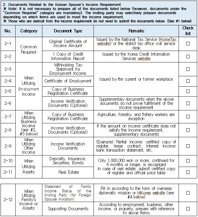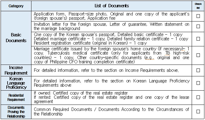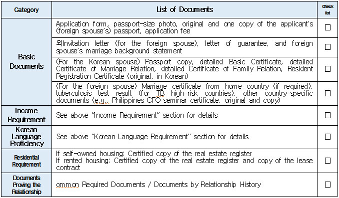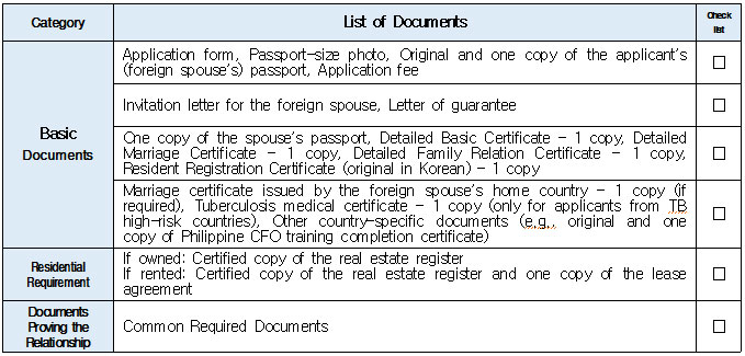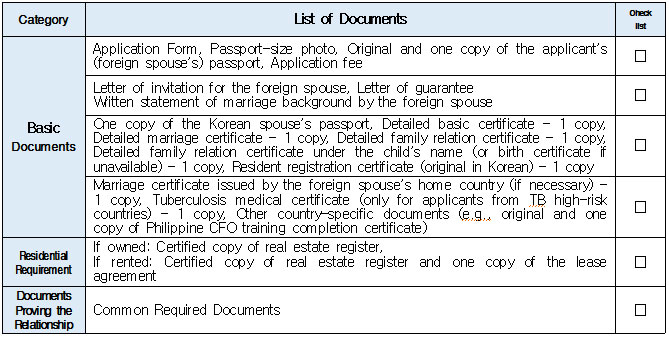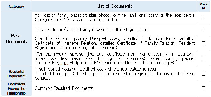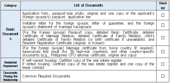 | Eligible Persons and Scope of Activity | A person whose marriage has been validly established in Korea and who intends to reside in Korea to continue their marital life with a Korean national