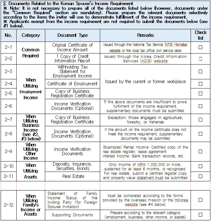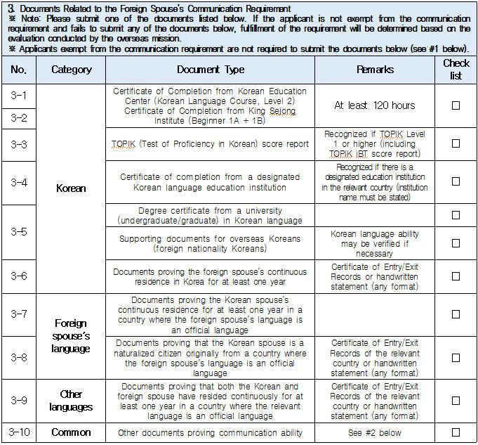 1. Eligible Applicants * Individuals currently residing legally in Korea who wish to change their status to “Spouse of a Korean National (F‑6‑1).” * Exception: Individuals residing under the “Tourism-Employment (H‑1)” status are **not eligible** for a change to F‑6 under the “Tourism-Employment (H‑1) Visa Issuance and Stay Management Guidelines.” In general, the following are not eligible for status change and must exit Korea and re-enter by obtaining a new visa from a Korean diplomatic mission: 1. Short-term visa holders 2. Illegal residents (including unauthorized entrants and users of forged or altered passports) 3. Individuals granted permission to extend stay for departure (those granted a grace period to depart are not eligible for status change) 4. General criminal offenders (excluding those fined only) 5. Those who, while in any of the above statuses, received an “Other (G‑1)” status *Short-term visa entrants include holders of Visa Waiver (B‑1), Tourist Transit (B‑2), Temporary Coverage (C‑1), and short-term employment (C‑4) visas.* *Exception:* German nationals who entered under Visa Waiver (B‑1) **may** be eligible to change to F‑6. However, if a status change is deemed unavoidable for humanitarian reasons —such as pregnancy, childbirth, or caring for a child born within the marriage (excluding adopted children)—a case-by-case review may allow change within Korea. ([네이버 블로그][1]) 2. Period of Stay Granted: Up to 1 year ([네이버 블로그][2]) 3. Authorized for Approval: Director of the district immigration office (or branch thereof) ([네이버 블로그][2]) 4. Required Documents: Generally based on documentation required for F‑6 visa issuance; additional or reduced documents may be requested during submission and review ([네이버 블로그][2]) B. Permission to Change Residence Status for a Parent Raising a Minor Child (F‑6‑2) ![]() 1. Eligible Applicants * Foreigners residing under a status other than F‑6 who are the father or mother raising (or intending to raise) in Korea a minor child born from a marital relationship (including de facto marriage) with a Korean national. 2. Period of Stay Granted : 1 year 3. Required Documents may include: * Application (form No. 34), passport, alien registration card (if applicable), one passport-style photo, and fee * Certificate of basic family registry and family relationship certificate in child’s name (if the child is Korean) * Proof of family (parent–child) relation (e.g., birth certificate or genetic test documentation) * Proof of child‑rearing (e.g., custody court decision, family registry listing the child, confirmation from local community leaders or relatives within the 5th degree in Korea) * Proof of marital termination (e.g., divorce, spouse’s death or disappearance), if applicable * Criminal record certificate and health check (exempt if previously submitted and the applicant hasn’t stayed continuously abroad for 6 months or more) * Other documents deemed necessary by the immigration office C. Permission to Change Status for Individuals Whose Marriage Has Ended (Spouse’s Death, Disappearance, etc.) (F‑6‑3) ![]() 1. Eligible Applicants (must meet all of the below): * Foreigners residing under a status other than F‑6 * Those whose marriage to a Korean national has ended due to death, disappearance, or other reasons not attributable to them, and who cannot maintain a normal marital relationship—**excluding** short-term stayers, criminal offenders (excluding those fined only), and those extended a stay to depart; also excluding those who were in those restricted statuses but were later granted G‑1. * Note : Applicants already residing under F‑6 at the time remain eligible for renewal, not status change. 2. Period of Stay Granted : **1 year** 3. Required Documents include: * Common documents: Application (form No. 34), passport, alien registration card, photo, fee, criminal record, health check (with same exemption criteria as above) * For spouse’s death: death certificate or basic family registry form stating death; document proving marriage * For divorce: marriage registry stating divorce, divorce court documents, proof of fault when applicable (e.g., hospital report, non-prosecution decision, certification by women’s rights group, relative statements, community confirmation) * For disappearance: disappearance ruling documentation; proof of marital relationship * Additional documents may be requested if necessary by immigration authorities 4. Authorized for Approval : Director of the district immigration office D. Permission to Change to Household Affairs (F‑1‑6) for Post‑Marriage Property or Estate Matters 1. Eligible Applicants * Individuals whose marriage to a Korean national has ended, who do not qualify under F‑6‑3, but whose stay in Korea is unavoidable due to property division, estate matters, or similar reasons. 2. Review Criteria & Considerations : Necessity to stay and whether a normal marriage was maintained beforehand 3. Period of Stay Granted : Up to 6 months (the F‑1‑6 status can be granted for up to 1 year from the date of status change) 4. Required Documents : * Application (form No. 34), passport, alien registration card, photo, fee * Guarantee letter (guarantor must be specified) * Marriage registry showing divorce * Documentation explaining why stay is unavoidable (e.g., property division documents) * Additional documents deemed necessary by the immigration office * Proof of residence (e.g., lease contract, employer’s housing certification, notice for approaching stay expiration, utility bills, dorm receipts) * #2 (Other Documents Proving Communication Ability) If either the Korean spouse or the foreign spouse ① submits a language proficiency test score above a certain level, or ② passes an interview conducted in the relevant language at the embassy, they may be recognized as having met the com