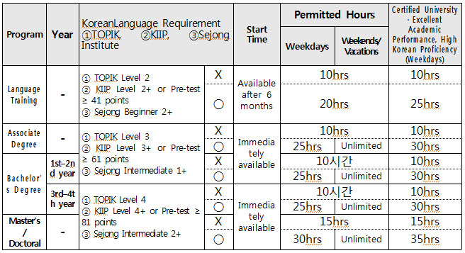 Eligibility for Permission Graduate (Master’s or Doctoral) students currently enrolled or who have completed coursework and wish to work as a “student researcher” under an employment contract at a **government-funded research institute** other than their university. Scope of Government-Funded Research Institutes * Research institutes established under Article 8 of the *Act on the Establishment and Operation of Government-Funded Science and Technology Research Institutes. * Specific research institutes under Article 3 of the *Enforcement Decree of the Act on the Promotion of Specific Research Institutes. * Research centers under Article 14 of the *Special Act on the Establishment and Support of the International Science and Business Belt. ※ Students at UST (University of Science and Technology) or KAIST are permitted to receive stipends for participating in research projects at their university without needing separate permission. Required Documents * Employment contract * Copy of the research institute's business registration certificate * Application fee Important Notes * Students with a D-2 (Student) visa cannot engage in research activities under a "Researcher" visa. * D-2 visa holders are not permitted to work as researchers at private companies (including university-industry cooperation foundations) without a change of status. * Dispatch or support work at external research institutes not affiliated with the university is strictly prohibited. 2. Part-Time Employment (Arbeit) for Foreign Students A. Basic Principles * Only simple part-time jobs typically undertaken by students are allowed. * Specific employment types listed in Enforcement Decree of the Immigration Act [Appendix 1-2] are subject to individual guidelines (e.g., Presidential English Volunteer Scholarship, conversation instructors, professional translation/interpretation, etc.). * Private tutoring is strictly regulated due to its specific nature (location, target audience, etc.). Permission Process : 1. Prepare an employment contract (standard format, including hourly wage). 2. Fill out the "Part-Time Employment Confirmation" form (provided by the university's international student office). 3. Submit application (with supporting documents) online or in person. 4. Approval/Denial (sticker attached to foreign registration card or printable approval letter online). B. Eligibility * Must have a certain level of Korean proficiency and be verified by the university's international student advisor. * Applicable for D-2-1 to D-2-4, D-2-6, D-2-7 * D-4-1, D-4-7 (language training) and D-2-8 (exchange students) : Eligible only after 6 months from entry or status change * Students granted exceptional stay due to failure to graduate are not eligible * Exception: Thesis-writing students in graduate programs (Master’s/Ph.D.) may be permitted * Students with delayed graduation due to poor grades or low attendance are not eligible * Weekly working hour limit : 30 hours * No unlimited work allowed during holidays, weekends, or school breaks C. Permitted Working Hours by Program & Language Ability (Effective July 2023) ![]() ※ English Track Program: Regardless of year level, applicants who hold an English proficiency certificate of at least TOEFL 530 (CBT 197, iBT 71), IELTS 5.5, CEFR B2, or TEPS 601 (NEW TEPS 327) are eligible. Applicants from countries where English is an official language are exempt from submitting such certificates. Permitted Fields (Examples) : * General translation/interpretation, food service assistance, office support * Tourism assistance, duty-free shop sales * Not allowed : Manufacturing, construction (except those with TOPIK Level 4 or higher) * Seasonal part-time or full-time work allowed * Internship in E-1\~E-7 fields during vacations is allowed (if qualifications are met) Note : If the place of work changes, a new permit must be obtained. D. Approval Criteria * Previous semester GPA below C (2.0) or language course attendance below 90% → not eligible * Applicants who violated permit conditions or were previously flagged → not eligible * Not allowed : * Professional fields (E-1 to E-7), non-professional employment (E-9, E-10) * Teaching minors or working in educational institutions for children (exceptions apply) * Special employment types: delivery, courier, substitute driving, insurance agents, visiting instructors, door-to-door sales * Dispatch work, outsourcing, remote or distant jobs E. Application Guidelines * D-4 (Language Trainees): Up to 6 months during stay, at 1 workplace * D-2 (Students) : Up to 1 year during stay, at up to 2 workplaces within allowed hours F. Required Documents * Passport, Alien Registration Card, Application Form * Part-Time Employment Confirmation for Foreign Students * Transcript or Attendance Certificate (can be omitted if verifiable online) * Proof of Korean proficiency (if applicable) * Copy of employer’s business registration, standard employment contract * Confirmation of compliance with part-time work conditions (if applicable) G. Special Cases (No Permission Required) * Activities not affecting core visa purpose : receiving stipends, awards, or daily compensation H. Penalties for Violations * Construction-related violations: Deportation upon first offense (entry ban deferred) 3. Income-Generating Research by D-2 Students At the Home University : * Participation in academic/research internships: No separate permit required * Participation in non-academic research/internships : Permit required Outside the Home University : * Academic-related research/internship : Permit required * Non-academic research/internship : Requires E-3 activity permit 4. Field Training Semester Programs * Standard or mandatory training under the * University Field Training Semester Guidelines : No permit required * Voluntary internships : Permit required 5. Employment Permit for Spouses of D-2 Students Spouses of D-2 visa holders may work only after obtaining permission for acti