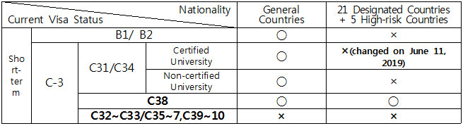 a. (Basic Principle) Change of status is allowed for long-term residents legally staying in Korea after foreign registration; however, change of status is generally restricted for short-term residents (B, C visa categories). Exceptions apply in the following cases : ① Among registered foreigners, those holding qualifications other than Technical Training (D-3), Seasonal Labor (E-8), Non-professional Employment (E-9), Seafarer Employment (E-10), and Humanitarian Stay Permission (G-1-6) are restricted from changing status. ② However, short-term legal residents under ① who plan to enroll in an educational course starting before their current stay period expires, and ③ meet at least one of the following conditions are exceptionally allowed to change status.