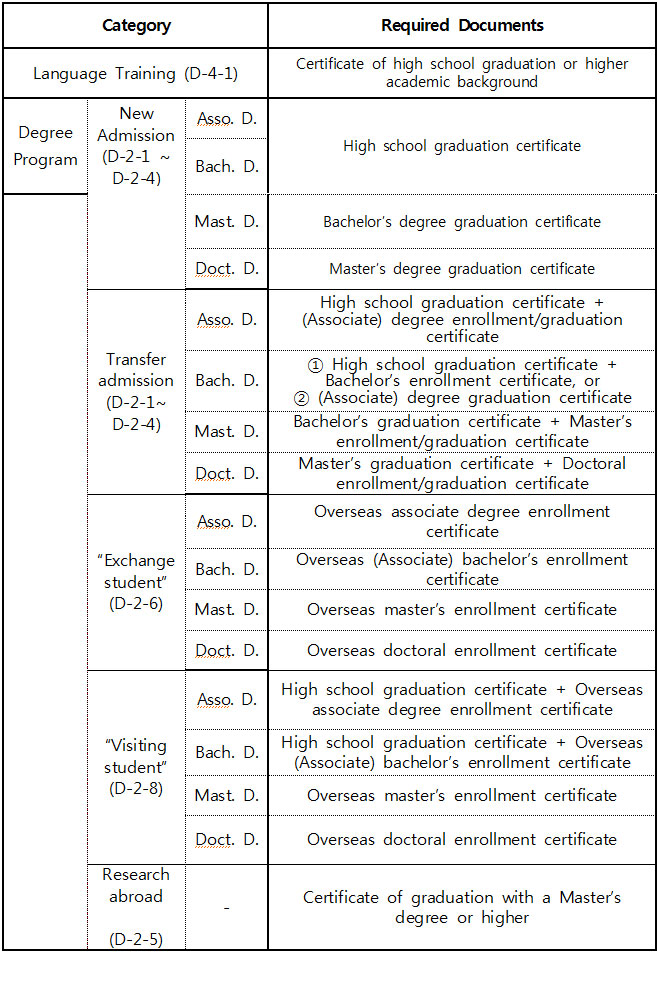 Universities or academic research institutions that are junior college level or higher, established under the Higher Education Act or other special laws, and that meet the qualifications designated by the Minister of Justice. This also includes affiliated language institutes of such universities. Excluded Institutions (Not Eligible for Student Visa Status) The following institutions are not eligible for student (D-2) visa purposes: * Broadcasting universities, correspondence universities, broadcasting correspondence universities, and cyber universities (online universities) under Article 2, Clause 5 of the Higher Education Act * Lifelong education institutions under Article 2, Clause 2 of the *Lifelong Education Act * Vocational colleges offering "vocational training programs" under Article 2, Clause 5 of the National Lifelong Vocational Competency Development Act * Evening universities or graduate schools, except for specific evening degree programs where student visa eligibility is permitted * Graduate schools without daytime programs and evening specialized courses at junior colleges —only those that have passed prior screening by the relevant immigration office are eligible International Students Foreign nationals who are enrolled in regular academic programs or conducting specific research at the above-listed institutions fall under : * Student (D-2) visa category * Language Training (D-4-1, D-4-7) visa category Detailed Visa Subcategories Degree Programs (D-2) : * D-2-1 : Associate Degree Program (Junior College) * D-2-2 : Bachelor's Degree Program * D-2-3 : Master's Degree Program * D-2-4 : Doctoral Degree Program * D-2-5 : Research Program * D-2-6 : Exchange Student * D-2-7 : Work-Study Linked Program * D-2-8 : Visiting Student Language Training (D-4): * D-4-1 : Korean Language Training * D-4-7 : Foreign Language Training |