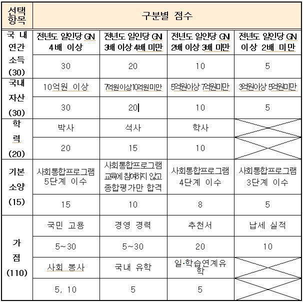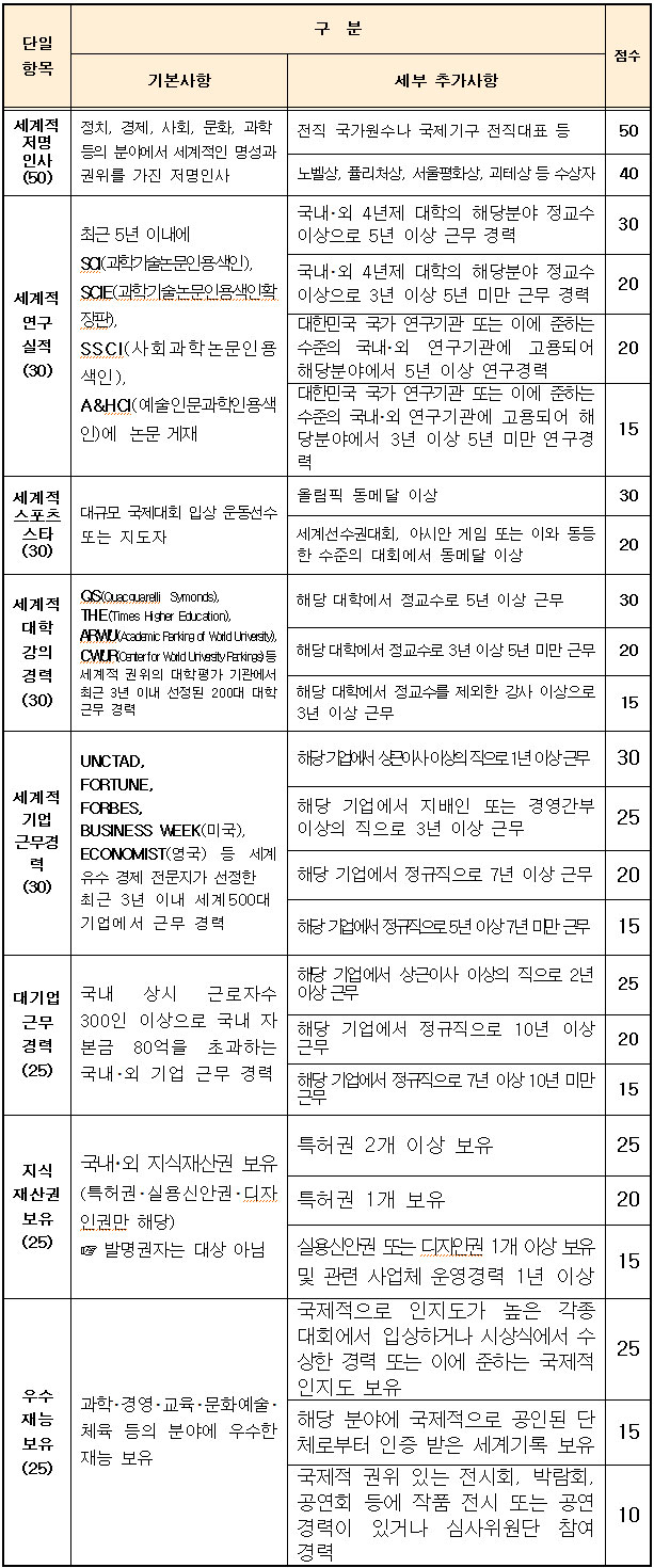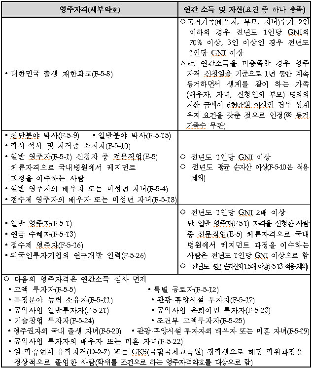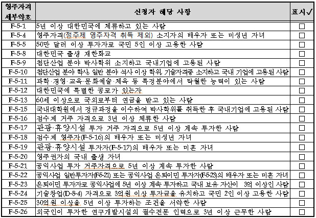 1. 대한민국 「민법」에 따른 성년으로서 별표 1의2 중 10. 주재(D-7)부터 20. 특정활동(E-7)까지의 체류자격이나 별표 1의2 중 24. 거주(F-2) 체류자격으로 5년 이상 대한민국에 체류하고 있는 사람 2. 국민 또는 영주자격(F-5)을 가진 사람의 배우자 또는 미성년 자녀로서 대한민국에 2년 이상 체류하고 있는 사람 및 대한민국에서 출생한 것을 이유로 법 제23조에 따라 체류자격 부여 신청을 한 사람으로서 출생 당시 그의 부 또는 모가 영주자격(F-5)으로 대한민국에 체류하고 있는 사람 중 법무부장관이 인정하는 사람 3. 「외국인투자 촉진법」에 따라 미화 50만 달러를 투자한 외국인투자가로서 5명 이상의 국민을 고용하고 있는 사람 4. 별표 1의2 중 26. 재외동포(F-4) 체류자격으로 대한민국에 2년 이상 계속 체류하고 있는 사람으로서 대한민국에 계속 거주할 필요가 있다고 법무부장관이 인정하는 사람 5. 「재외동포의 출입국과 법적 지위에 관한 법률」 제2조제2호의 외국국적동포로서 「국적법」에 따른 국적 취득 요건을 갖춘 사람 6. 종전 「출입국관리법 시행령」(대통령령 제17579호로 일부개정되어 2002. 4. 18. 공포ㆍ시행되기 이전의 것을 말한다) 별표 1 제27호란의 거주(F-2) 체류자격(이에 해당되는 종전의 체류자격을 가진 적이 있는 사람을 포함한다)이 있었던 사람으로서 대한민국에 계속 거주할 필요가 있다고 법무부장관이 인정하는 사람 7. 다음 각 목의 어느 하나에 해당하는 사람으로서 법무부장관이 인정하는 사람 - 가. 국외에서 일정 분야의 박사 학위를 취득한 사람으로서 영주자격(F-5) 신청 시 국내 기업 등에 고용된 사람 - 나. 국내 대학원에서 정규과정을 마치고 박사학위를 취득한 사람 8. 법무부장관이 정하는 분야의 학사 학위 이상의 학위증 또는 법무부장관이 정하는 기술자격증이 있는 사람으로서 국내 체류기간이 3년 이상이고, 영주자격(F-5) 신청 시 국내기업에 고용되어 법무부장관이 정하는 금액 이상의 임금을 받는 사람 9. 과학․경영․교육․문화예술․체육 등 특정 분야에서 탁월한 능력이 있는 사람 중 법무부장관이 인정하는 사람 10. 대한민국에 특별한 공로가 있다고 법무부장관이 인정하는 사람 11. 60세 이상으로서 법무부장관이 정하는 금액 이상의 연금을 국외로부터 받고 있는 사람 12. 별표 1의2 중 29. 방문취업(H-2) 체류자격으로 취업활동을 하고 있는 사람으로서 같은 표 중 24. 거주(F-2)란의 사목 1)부터 3)까지의 요건을 모두 갖추고 있는 사람 중 근속기간이나 취업지역, 산업 분야의 특성, 인력 부족 상황 및 국민의 취업 선호도 등을 고려하여 법무부장관이 인정하는 사람 13. 별표 1의2 중 24. 거주(F-2) 자목에 해당하는 체류자격으로 대한민국에서 3년 이상 체류하고 있는 사람으로서 대한민국에 계속 거주할 필요가 있다고 법무부장관이 인정하는 사람 14. 별표 1의2 중 24. 거주(F-2) 차목에 해당하는 체류자격을 받은 후 5년 이상 계속 투자 상태를 유지하고 있는 사람으로서 대한민국에 계속 거주할 필요가 있다고 법무부장관이 인정하는 사람과 그 배우자 및 자녀(법무부장관이 정하는 요건을 갖춘 자녀만 해당한다) 15. 별표 1의2 중 11. 기업투자(D-8) 다목에 해당하는 체류자격으로 대한민국에 3년 이상 계속 체류하고 있는 사람으로서 투자자로부터 3억원 이상의 투자금을 유치하고 2명 이상의 국민을 고용하는 등 법무부장관이 정하는 요건을 갖춘 사람 16. 5년 이상 투자 상태를 유지할 것을 조건으로 법무부장관이 정하여 고시하는 금액 이상을 투자한 사람으로서 법무부장관이 정하는 요건을 갖춘 사람 17. 별표 1의2 중 11. 기업투자(D-8) 가목에 해당하는 체류자격을 가지고 「외국인투자촉진법 시행령」 제25조제1항제4호에 따른 연구개발시설의 필수전문인력으로 대한민국에 3년 이상 계속 체류하고 있는 사람으로서 법무부장관이 인정하는 사람 18. 별표 1의2 중 24. 거주(F-2) 다목에 해당하는 체류자격으로 2년 이상 대한민국에 체류하고 있는 사람 |