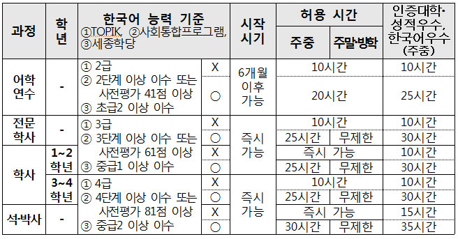 허가대상 석·박사 과정에 재학 중이거나 수료한 학생으로서 소속 대학 이외의 정부출연연구기관에서 ‘학생연구원’으로 고용계약을 맺고 근무하려는 사람 정부출연연구기관의 범위 * 「과학기술분야 정부출연연구기관 등의 설립·운영에 관한 법률」 제8조에 따른 연구기관 * 「특정연구기관육성법 시행령」 제3조에 따른 특정연구기관 * 「국제과학비즈니스벨트 조성 및 지원에 관한 특별법」 제14조에 따른 연구원 과학기술연합대학원대학교(UST), KAIST 소속 학생은 소속 대학 연구프로젝트 참여 시 수당 지급이 가능하므로 별도 허가 불필요 제출서류 * 고용계약서 * 연구원 사업자등록증 사본 * 수수료 주의사항 * 유학생은 연구 자격으로의 자격외 활동이 금지됨 * 학생(D-2)은 일반 기업(대학 산학협력단 포함) 또는 단체의 연구원으로 활동 불가하며, 자격변경을 통해서만 취업 가능 * 소속 대학이 아닌 외부 연구소로의 파견, 지원 근무는 엄격히 금지 2. 외국인 유학생 시간제 취업(아르바이트) 가. 기본 원칙 * 학생이 통상적으로 행하는 단순노무 등 시간제 취업 활동에 한정 * 「출입국관리법 시행령」 \[별표1-2] 해당 취업활동은 개별 지침 적용 (예: 대통령 영어봉사장학생, 회화지도강사, 전문통번역 등) * 개인과외 교습행위는 장소, 대상 등 특수성을 고려해 엄격히 제한 허가절차 1. 고용계약서 작성 (표준근로계약서, 시급 기재) 2. 시간제취업확인서 작성 (별지 서식, 대학 유학생 담당자 작성) 3. 신청 (첨부서류 지참, 온라인 또는 방문) 4. 허가·불허 (허가 스티커 부착 또는 온라인 허가서 출력) 나. 대상 * 일정 수준의 한국어 능력을 보유하고 대학 유학생 담당자의 확인을 받은 자 · 유학 체류자격 D-2-1\~D-2-4, D-2-6, D-2-7 · 어학연수(D-4-1, D-4-7) 및 방문학생(D-2-8)은 입국일 또는 자격 변경일로부터 6개월 경과 후 가능 * 졸업요건 미달로 예외적 체류허가를 받은 자는 제외 · 단, 석·박사 과정 수료 후 논문준비생은 허용 가능 · 학점미달, 출석률 미달 등 불성실 학업으로 인한 졸업 지연자는 제외 * 허용 시에도 주당 30시간 제한, 휴무일·공휴일·방학 중 무제한 허용 규정은 적용되지 않음 다. 허용 범위 한국어 능력별, 학위과정별 허용시간 (2023년 7월 시행) ![]() ※ 영어트랙 과정 : 학년에 관계 없이 TOEFL 530(CBT 197, iBT 71), IELTS 5.5, CEFR B2, TEPS 601점(NEW TEPS 327점) 이상 자격증 소지자, 영어 공용국가는 자격증 제출 면제 허용 분야 (예시) * 일반 통역·번역, 음식업 보조, 일반 사무보조 * 관광 안내 보조, 면세점 판매 보조 * 제조업·건설업은 원칙적 제한 (단, 제조업의 경우 TOPIK 4급 이상은 예외 허용) * 시간제·전일제 계절근로 가능 * 방학 중 학위과정 유학생의 전문분야(E-1\~E-7) 인턴 가능 (자격요건 충족 시) 장소 변경 시 새로 허가 받아야 함 허가 기준 * 직전 학기 성적 C학점(2.0) 미만 또는 출석률 90% 미만(어학연수)인 경우 제한 * 불성실 신고자, 허가 조건 위반자 등은 불허 * 직종 제한: 전문분야(E-1\~E-7), 비전문(E-9, E-10) 불가 * 미성년 학생 대상 외국어 교육시설 취업 제한 (특정 조건 충족 시 예외) * 택배, 배달, 대리운전, 보험설계사, 학습지 교사, 방문판매원 등 특수형태근로 종사 불가 * 파견, 도급, 알선, 원거리 근무 불가 처리 요령 * 어학연수생(D-4): 체류기간 내 최장 6개월, 장소 1곳 * 유학생(D-2): 체류기간 내 최장 1년, 시간제 취업 허용시간 범위 내 장소 2곳까지 가능 라. 신청서류 * 여권, 외국인등록증, 신청서 * 외국인 유학생 시간제취업 확인서 * 성적 또는 출석 증명서(전자 확인 가능 시 생략 가능) * 한국어 능력 증빙서류(해당자) * 사업자등록증 사본, 표준근로계약서 * 외국인 유학생 시간제취업 요건 준수 확인서(해당자) 마. 시간제 취업허가 특례 (허가 불필요) * 사례금, 상금, 일상생활 보수 등 본질적 사항을 침해하지 않는 활동 바. 위반자 처리 기준 * 건설업 분야는 1차 적발 시 출국명령 (입국규제는 유예) 사. 유학생(D-2)의 수익적 연구 활동 * 소속 대학 내 연구 활동 · 학업 연계 연구·인턴 참여: 허가 면제 · 학업 무관 연구·인턴 참여: 허가 필요 * 소속 대학 외 연구 활동 · 학업 연계 연구·인턴 참여: 허가 필요 · 학업 무관 연구·인턴 참여: 체류자격외 활동허가(E-3) 필요 아. 현장실습학기제 활동 * 「대학생 현장실습학기제 운영규정」에 따른 표준 현장실습학기제 및 필수 실습형 교육과정: 허가 면제 * 자율 현장실습은 허가 필요 3. 유학생(D-2) 배우자의 취업활동 허가 외국인의 취업 허용 업종에 대해 자격외 활동허가 후 취업 가능 (단, 단순 노무 직종은 제한) |