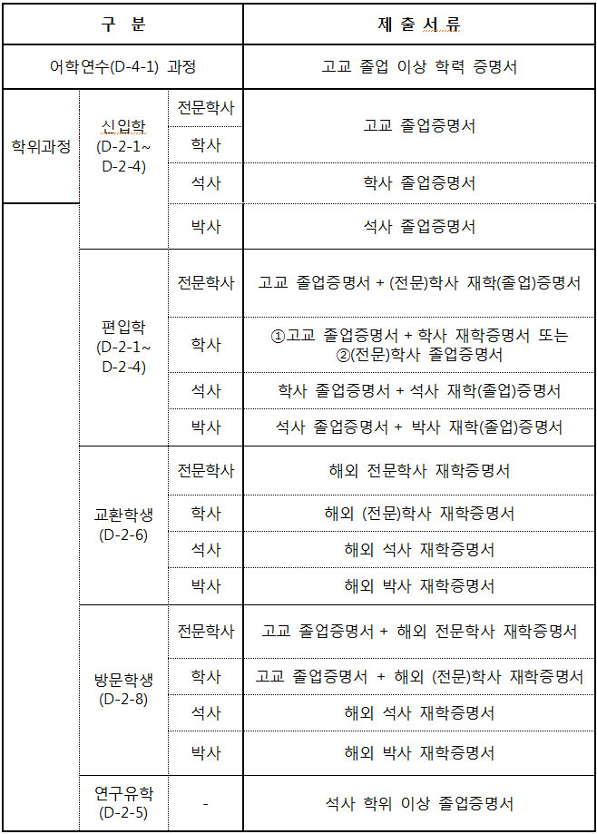 「고등교육법」 및 특별법에 따라 설립된 전문대학 이상의 교육기관이나 학술 연구기관으로서 법무부장관이 정하는 요건을 갖춘 대학 또는 부설 어학원 제외 대상 (유학 체류자격 대상 교육기관에서 제외) * 「고등교육법」 제2조 제5호에 따른 방송대학, 통신대학, 방송통신대학 및 사이버대학(원격대학) * 「평생교육법」 제2조 제2호에 따른 평생교육기관 * 「국민 평생 직업능력 개발법」 제2조 제5호에 따른 기능대학 중 ‘직업훈련과정’ * 유학 체류자격을 허용하는 일부 야간 학위과정을 제외한 야간대학 및 대학원 *주간 교육과정이 없는 야간대학원, 전문대학 전공심화 야간과정으로서 관할 출입국관서의 사전 심사를 거친 과정만 가능* 외국인 유학생 위 교육기관에서 정규과정을 이수하거나 특정 연구를 하고자 하는 외국인으로서 유학(D-2) 및 어학연수(D-4-1, D-4-7)에 해당 적용 대상별 세부 약호 학위과정 (D-2) * D-2-1 전문학사과정 * D-2-2 학사과정 * D-2-3 석사과정 * D-2-4 박사과정 * D-2-5 연구과정 * D-2-6 교환학생 * D-2-7 일·학습연계 유학 * D-2-8 방문학생 어학연수 (D-4) * D-4-1 한국어 연수 * D-4-7 외국어 연수 |