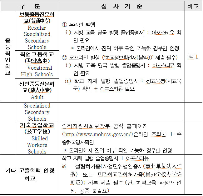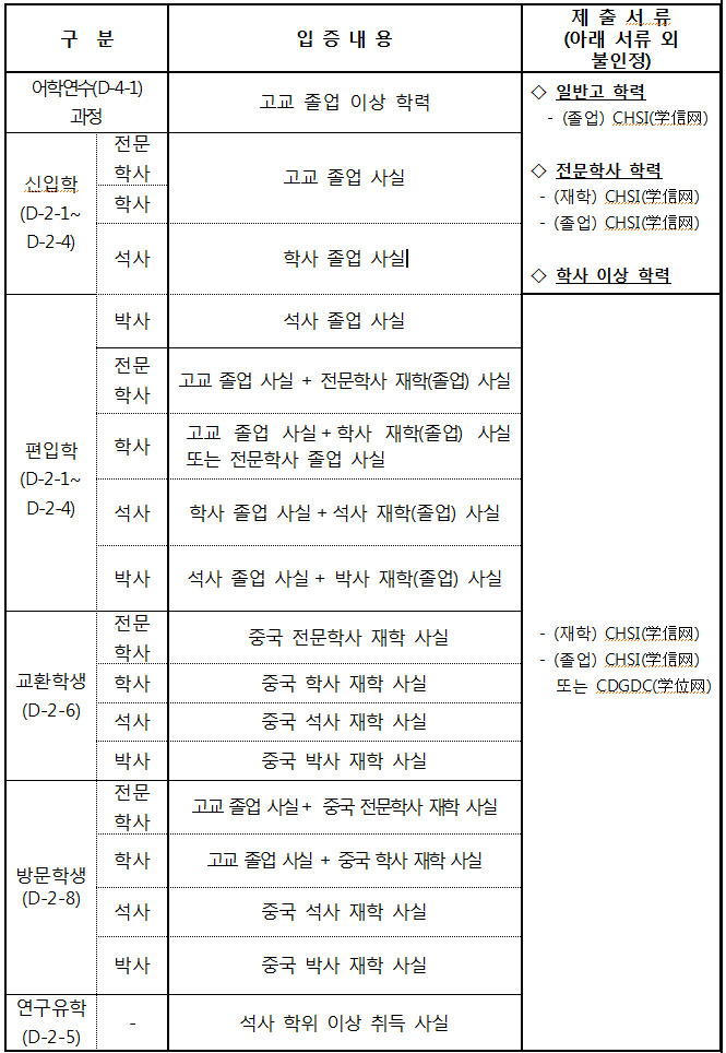 가. (기본원칙) 외국인 등록 후 국내에서 합법적으로 체류 중인 장기체류자에 대해서는 자격변경 허용, 단기체류자(B, C 계열 자격)에 대해서는 원칙적으로 자격변경 제한. 다만, 아래의 경우 예외적용 ① 등록외국인중 기술연수(D-3), 계절근로(E-8), 비전문취업(E-9), 선원취업(E-10), 인도적체류허가자(G-1-6)를 제외한 기타(G-1)자격 소지자는 자격변경 제한 ② 단, ①단기 합법체류자로서 ②본인의 체류기간 만료일 내 진학 예정 교육과정의 개강이 예정되어 있으며, ③아래 어느 하나에 해당하는 사유가 있는 사람 예외적으로 허용 <단기 체류자격 소지자 유학 자격변경 일람표> ![]() 나. 허가권한 : 체류지 관할 또는 대학 소재지 관할 출입국외국인관서장 다. 제출서류 공통서류 ① 신청서(별지 제34호 서식), 여권, 사진 1매, 수수료 ② 교육기관 사업자등록증 (또는 고유번호증) 사본 ③ 표준입학허가서 (대학 총․학장 발행) ④ 결핵진단서 (해당자에 한함) ⑤ 가족관계 입증서류 (부모의 잔고증명 등을 제출한 경우에 한함) ⑥ 최종학력 입증서류 * 최종학력 입증서류는 원본 심사를 원칙. 다만, 학위 등 인증보고서 등은 대학담당자의 원본 대조필인이 있을 경우 사본도 인정 가능하고 개인이 직접 신청하여 발급한 학력입증서류는 유효기간 내에서만 인정 * 일반국가 아래 표에서 정한 방식의 학력증명서를 ① 아포스티유(Apostille) 확인 또는 ② 영사(출신학교가 속한 국가 주재 한국영사 또는 주한 공관 영사) 확인을 받아 제출 ![]() ![]() ![]() ⑦ 재정능력 입증서류 * 1년간 등록금 및 체재비 상당하는 금액 * 베트남의 경우 은행에서 발행한 지급유보방식의 별도 유학경비 잔고증명서 과정별 제출서류 특정 연구과정 (D-2-5) * 최종학력 입증서류(석사학위 이상 소지자를 원칙으로 함) ※ 석사 학위 이상 취득자를 원칙으로 하나 다음의 경우는 본국 학사과정 재학 중인 사람도 허용 ① 「특정연구기관 육성법 시행령」 제3조에 따른 특정연구기관으로 지정된 대학이 연구과정 유학생(D-2-5)을 초청하는 경우 ② THE(Times Higher Education) 선정 200대 또는 QS(Quacquarelli Symonds) 선정 상위 500위 이내 국내 대학에서 이공계 분야 연구과정 유학생(D-2-5)을 초청하는 경우 * 신원보증서 또는 체재비 입증서류(잔고증명, 연구수당 지급 확인서 등) * 특정 연구과정임을 입증하는 서류(붙임2) 교환학생 (D-2-6) * 소속(본국) 대학의 장이 발급한 추천서 * 교환학생임을 입증하는 서류 (초청 대학의 공문, 대학 간 체결한 학생교류 협정서 등) * 1학기 이상을 외국 정규대학에서 수학하였음을 입증하는 서류 (본국 대학의 재학증명서 등) 2. 하위대학 어학(한국어, 영어)능력 요건 특례 적용 대상: 하위대학의 입학생(D-2-1\~D-2-8)으로 법무부장관 고시 21개국 및 중점관리 5개국 국민에게 적용 한국어 능력 * (전문대학) ① 한국어능력시험(TOPIK) 3급, ② 사회통합프로그램 3단계 이상 이수하거나 사전평가 61점 이상 취득, ③ 세종학당 한국어 중급1 과정 이상 이수 * (대학·대학원) ① 한국어능력시험(TOPIK) 4급, ② 사회통합프로그램 4단계 이상 이수하거나 사전평가 81점 이상 취득, ③ 세종학당 한국어 중급2 과정 이상 이수 * (교환학생) 학위과정 구분에 관계없이 ① 한국어능력시험(TOPIK) 2급, ② 사회통합프로그램 2단계 이상 이수하거나 사전평가 41점 이상 취득, ③ 세종학당 한국어 초급2 과정 이상 이수 ※ 다음의 어느 하나에 해당하는 경우 한 단계 완화된 기준 적용 ① 동일대학 상급 과정으로 진학하는 유학생 ② 전문학사 과정의 뿌리산업양성학과 유학생 ③ 학사 이상 과정의 예체능 학과 유학생 ※ 단, 온라인 세종학당 수료증은 제외되며, 세종학당 수료증은 현지 세종학당에서 발급한 기본교육과정 수료증에 한함. 유학생이 국내 체류하면서 해외 세종학당의 교육과정에 온라인으로 참여한 경우 온라인 세종학당으로 표기되지 않더라도 수료증 불인정 영어 능력 * TOEFL 530(CBT 197, iBT 71), IELTS 5.5, TEPS 601점(NEW TEPS 327점) 이상 ※ 영어사용과정(영어트랙): 모집 단위를 별도로 설정하고 입학 시 ‘영어능력’을 검증하여 선발하는 과정으로, 졸업을 위해 이수해야 하는 학점의 50% 이상이 영어로 진행되는 학사 단위를 의미 ※ 영어를 모국어 또는 법적 공용어로 사용하는 국가의 국적을 소지한 학생은 중등교육 또는 고등교육을 이수한 증빙 서류(졸업증명서 등)로 영어 능력 시험 기준을 적용받지 않고 입학 가능. 단, 영어 공용어 국가 국민의 경우 이수한 교육과정이 영어 과정인 경우에만 인정 |