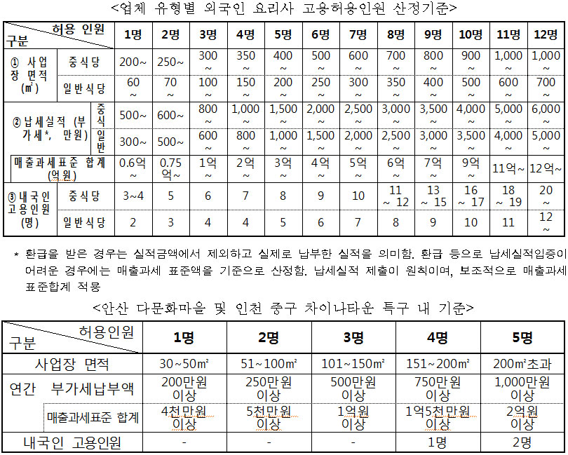 ❍ (적용원칙) 전문인력에 대해서는 국민대체가 어렵고, 국부창출 및 고용창출에 기여도가 높은 점 감안하여 임금요건 기준을 제외하고는 원칙적으로 적용하지 않음 ① 아래 각호의 경우 예외적으로 국민고용보호심사 기준 적용 ⅰ) 전문인력 중 초청장 남발 우려가 있는 기계공학 기술자, 제도사, 여행상품개발자, 해외영업원, 통․번역가 등에 대해서는 국민고용 보호 심사 기준을 예외적으로 적용 ⅱ) 전문인력중 국민고용보호 직종과 준전문인력, 일반기능인력, 숙련기능인력은 국민고용 침해 소지가 없도록 고용업체 자격요건 및 업체당 외국인 고용 허용인원 상한, 최저 임금요건 등을 설정하여 적용 ② 위 ①의 ⅰ), ⅱ)에도 불구하고 아래의 각호의 경우 직종에 관계없이 일반원칙에 따라 업체규모․고용비율 등 국민고용 보호를 적용하지 않음 ⅰ) 체류자격외활동허가 또는 근무처추가를 받아 파트타임으로 근무하는 경우에는 적용하지 않음 ⅱ) 정부초청 장학생으로 ‘일/학습연계유학(D-2-7)’자격 졸업자는 전문/준전문/일반기능에 대해 국민고용비율, 업체규모 적용을 면제하고 유사직종을 폭넓게 적용하여 허용 ❍ 국민고용 보호를 위한 일반 심사기준 - (고용업체의 규모) 국민 고용자가 5명 미만이고 내수 위주인 업체는 원칙적으로 초청을 제한, 고용인원은 고용부의 고용보험가입자명부에 최저임금을 충족하는 3개월 이상 등재된 인원을 말함 ☞ 3개월 이상 고용보험 가입자 명부를 제출해야 되므로 원칙적으로 개업 후 최소 3개월 이후 신청 가능 - (고용업체의 업종) 업종 특성을 감안하여 별도의 고용업체 요건을 정한 경우에는 해당 요건을 충족하여야 함 - (외국인 고용비율) 국민고용 보호 직종은 원칙적으로 국민고용자의 20% 범위 내에서 외국인 고용을 허용 ※ 숙련기능인력(E-7-4), 계절근로(E-8), 비전문취업(E-9), 선원취업(E-10), 방문취업(H-2), 거주(F-2), 재외동포(F-4), 영주(F-5), 결혼이민(F-6)은 외국인 고용인원에서 제외하되, 교수(E-1) 내지 특정활동(E-7-1~3) 등 취업 가능 체류자격은 외국인 고용인원에 포함하여 비율 산정 ※ 내국인 고용 입증은 고용보험관련 서류 제출(정규직으로 3개월 이상 계속 고용,신설 기업이라도 내국인 고용비율이 적용되는 업종은 일반적으로 사업자등록일 기준 3개월이 지난 후 신청함을 원칙으로 함) ※ 총 국민고용자의 20%를 초과하여 국민고용 보호 심사기준 적용대상 E-7 외국인을 고용 중인 업체는 신규 및 대체인력 초청과 체류자격변경, 근무처변경․추가 등을 원칙적으로 불허 - (임금요건) 저임금 편법인력 활용 방지를 위해 동종 직무를 수행하는 동일 경력 내국인의 평균임금과 연계하여 전문인력 수준에 따라 직종별로 차등 적용하여 심사 ⅰ) 전문인력 : 법무부 장관이 확정·공고한 임금요건 기준 적용 ⅱ) 준전문인력, 일반기능인력, 숙련기능인력 : 최저임금 이상 적용 ⅲ) 단, 일부직종*에 대해서는 해당 직종에서 별도로 정하는 기준을 따름 * 전문인력(E-7-1) 67개 직종 및 일반기능인력(E-7-3) 중 조선용접공, 선박도장공 등 - (중소·벤처·비수도권 중견기업 특례)* 고용 외국인 중 전년도 GNI의 80% 이상 임금 요건이 적용되는 직종에 종사 예정이고, 국내 기업 등에서 특정활동(E-7) 체류자격으로 근무한 경력이 없거나 3년 이하인 자에게 완화된 임금 요건 적용(전년도 GNI의 80% 이상 → 전년도 GNI의 70% 이상) * ①중소기업기본법 상 ‘중소기업(소상공인)확인서’로 확인되는 기업, ②벤처기업법 상 ‘벤처기업 확인서’로 확인되는 벤처기업 ③중견기업법 상 ‘중견기업 확인서’로 확인되는 비수도권 소재 중견기업 ※ 특례 임금 요건과 당해연도 공고한 금액이 상이한 경우 유리한 금액 적용 【 임금요건 심사 기준 】 ∘ 제출서류 : 계약서, 세무서 발행 전년도 소득금액 증명(기간연장, 근무처 변경 시 필수) ∘ 임금요건 기준 : 당해연도 법무부 장관이 확정·공고한 임금요건 기준으로 심사 - 신청일 기준으로 공고한 금액을 기준으로 함 ∘ 전년도 국민1인당 GNI : 한국은행이 매년 발표하며, 한국은행 홈페이지 통계사이트에 매년 공시하는 금액을 기준으로 함. ∘ 당해연도 최저임금 : 최저임금법(제10조)에 따라 고용노동부장관이 매년 8월경 고시하는 금액에 따르며, 별도 규정이 없으면 1월1일부터 해당 연도 최저임금을 적용 ∘ 고용계약서 : 반드시 고용계약서에 월 급여총액(연봉) 대비 근로시간을 명시하도록 하여 최저임금 위반 등이 발생하지 않도록 조치(1일 및 월간 근무시간 명시) ∘ 심사기준 적용 - ‘임금’요건 심사 시 금여총액인 연봉을 기준으로 심사 - 시급 및 월급 모두 최저임금 요건을 충족할 것, 근무시간이 적어 총액을 충족하지 못하는 경우 고용 제한(당해연도 최저임금 이상일 것) - 급여가 심사기준 이하인 경우 원칙적으로 발급 제한 ∘ 각종 특례 요건과 당해연도 확정·공고한 금액이 상이한 경우 유리한 금액 적용 2. 주의해야할 경과규정 ① 기존 특정활동(E-7) 자격으로 체류중인 외국인요리사에 대해서는 ‵18. 1. 1.이후에는 현 규정을 적용하되, 요건을 충족하지 못할 경우 허가 제한 ② ’23. 9.25 이전 숙련기능인력으로 전환하여 체
